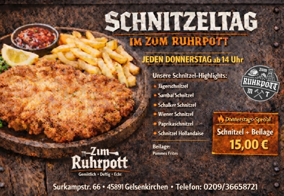 Bitte beachtet die Sonderöffnungszeiten zu den Spielen von Schalke 04 und die an diesem Tag gültige Speisekarte.